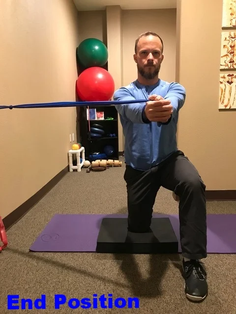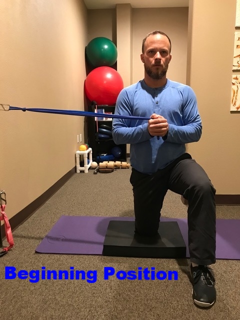 Use a stretchy band attached to a stationary anchor point, at shoulder height, at your side. Position yourself so that there is pretension in the band before you perform the movement. Press your hands forward, and resist spine rotation during the movement back and forth.