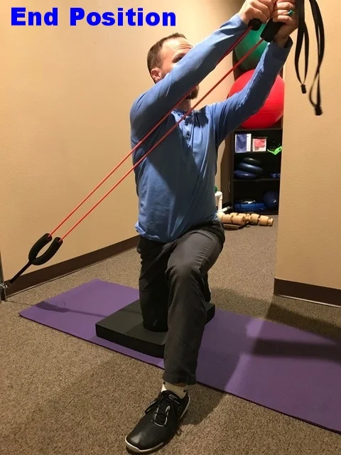 Similar to exercise above- Put the band attached to an anchor point by your side at ground level. Pull the band up in an arc (think of mimicking the motion of tossing an object up towards opposite shoulder).